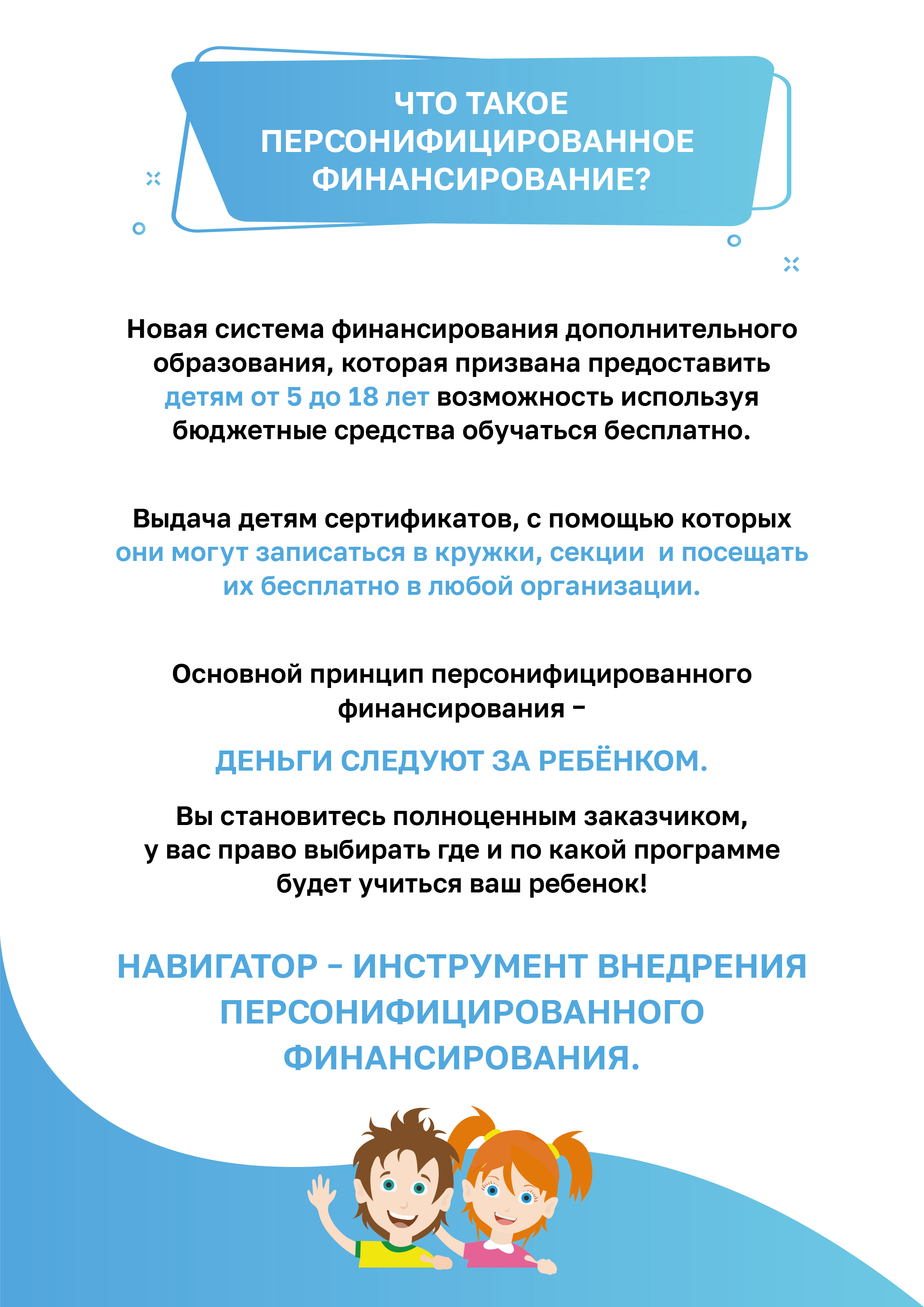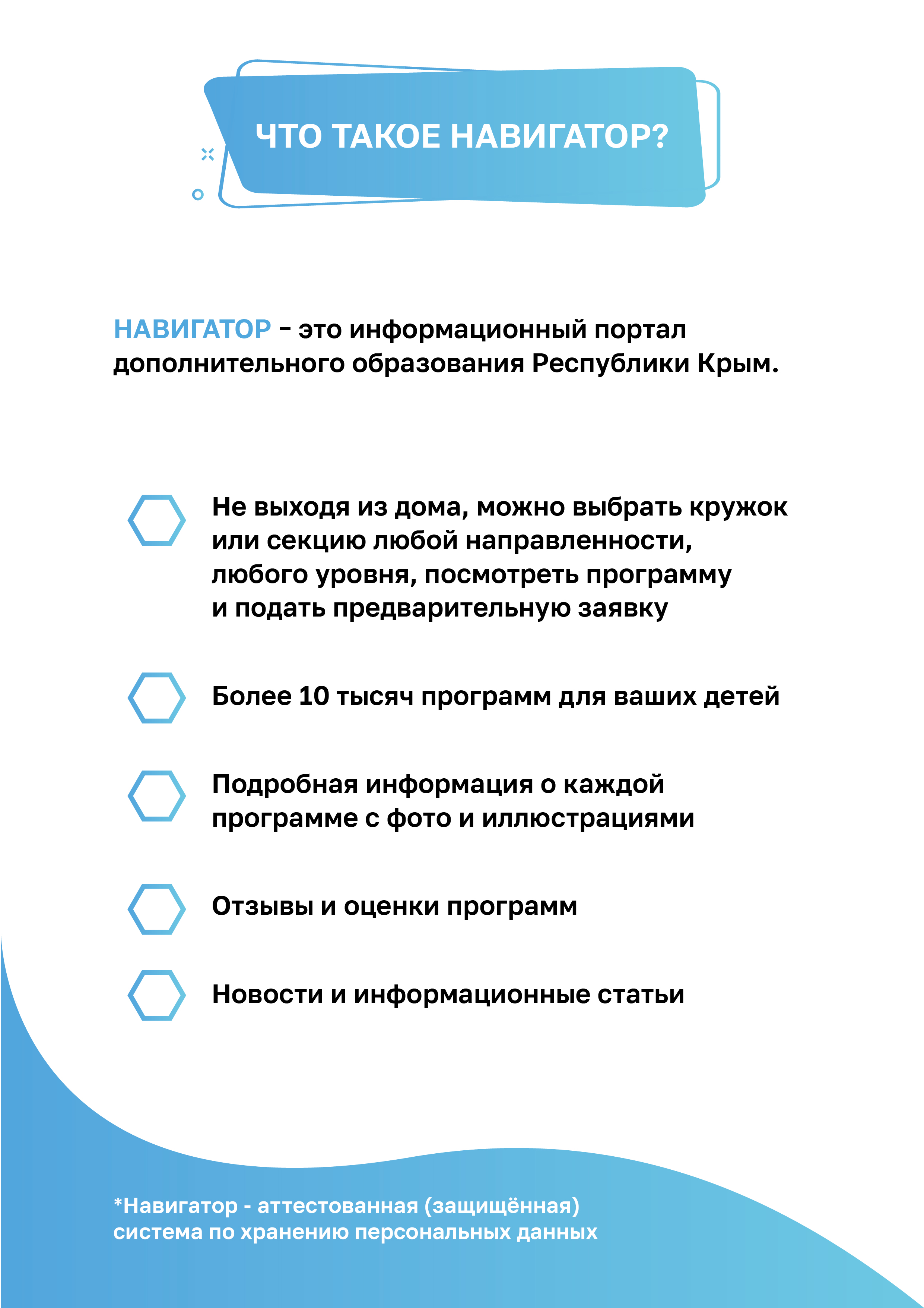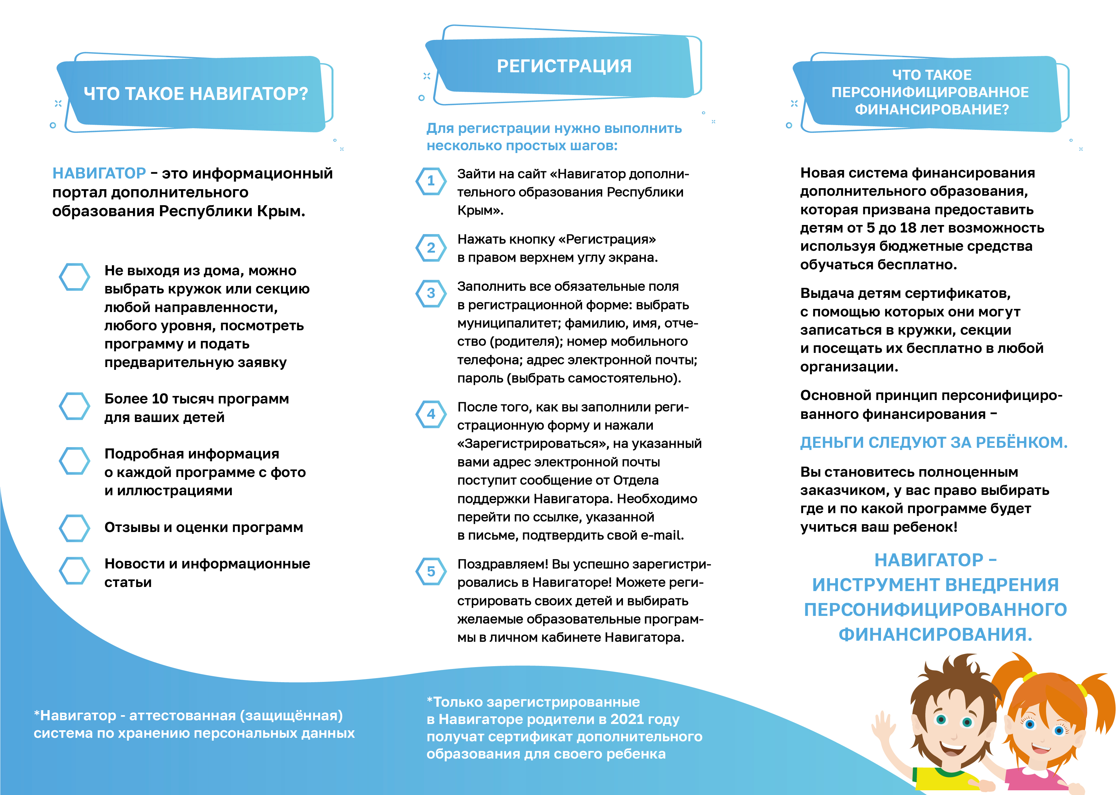 Навигатор рассчитан на родителей и детей, содержит сведения обо всех аккредитованных программах дополнительного образования. Также через навигатор можно оформить сертификат на дополнительное образование для каждого ребенка с 5 до 18 лет.